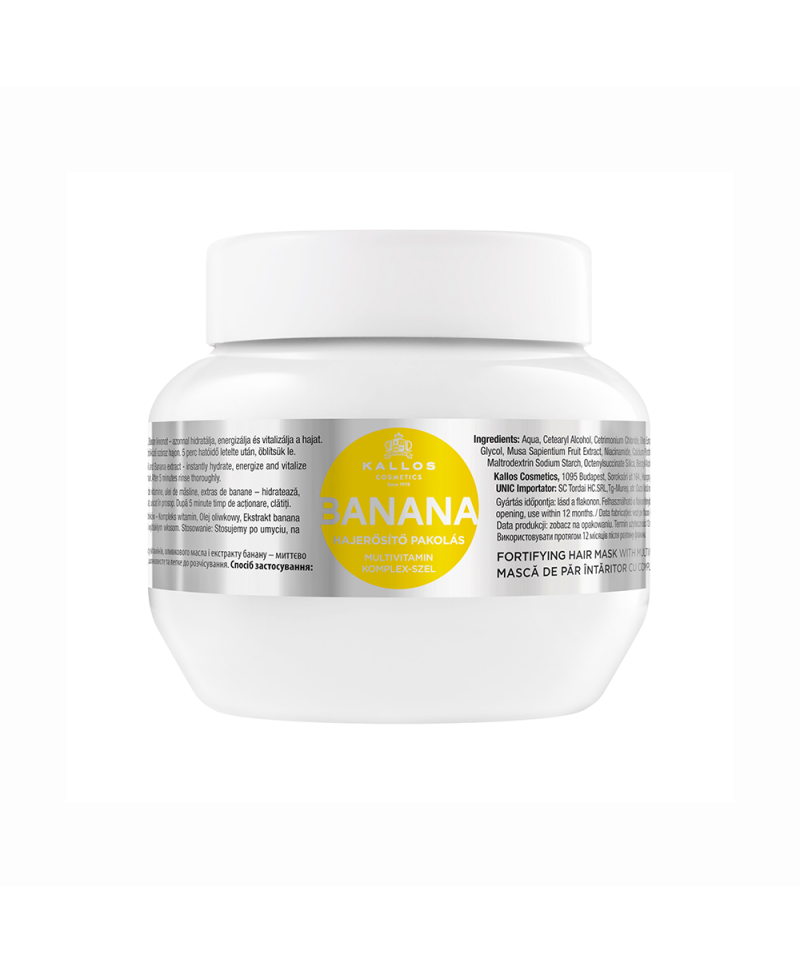 Sus ingredientes activos como la vitamina A, B1, B2, B3, B5, B6, C y E más aceite de oliva y extracto de plátano hidratan, nutren, energizan y revitalizan el cabello debilitado, ayudando además a disminuir la caída. Protege del calor y de los daños ambientales. Disfruta de un suave y exquisito aroma a banana. LIBRE DE PARABENOS – NO TESTEADO EN ANIMALES