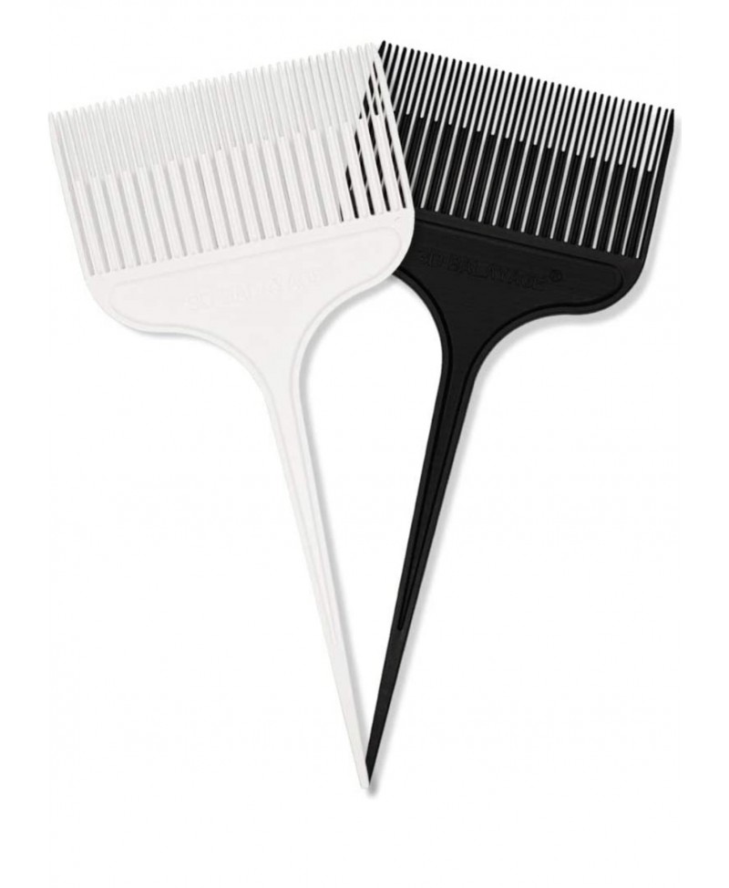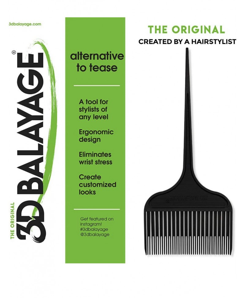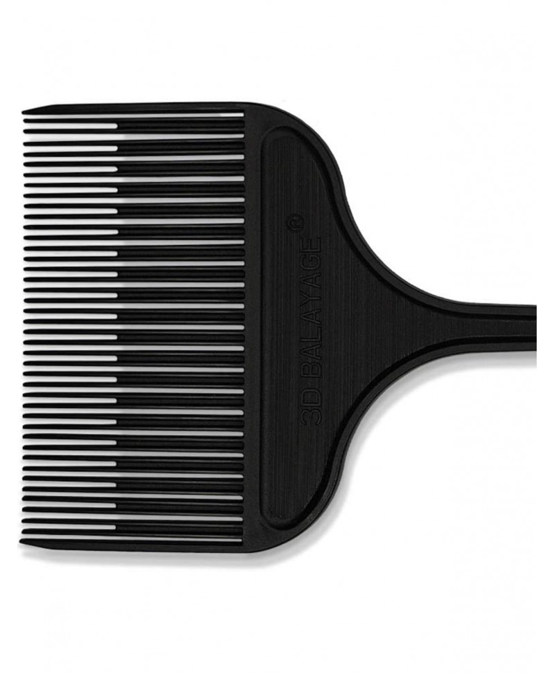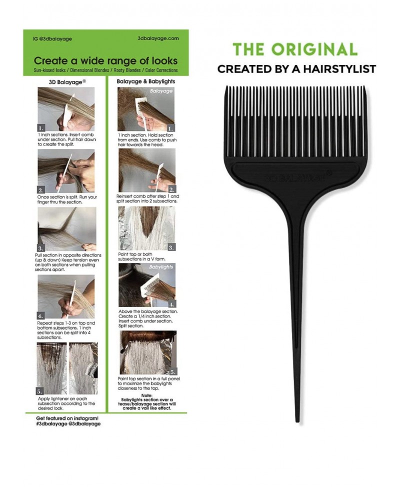 Este peine tiene una forma única de micro tejer el cabello. Divide cualquier sección de tamaño en dos sub-secciones iguales 50/50. El diseño tiene un patrón consistente de dientes de peine. Cada dos espacios entre los dientes del peine desciende hasta la mitad de la longitud del peine, lo que permite que el 50 por ciento de la sección baje completamente y se divida. La cercanía de los dientes está destinada a crear un micro tejido uniforme. Creando la máxima dimensión difusa dentro de cada sección al prea-clarar o teñir el cabello. Trabajar hasta la mitad de la sección de cabello creará un efecto de burla debido a la cercanía de los dientes del peine. Permitiendo a la persona que usa el peine crear un resultado dimensional y una mezcla perfecta. El mango que se extiende desde el ancho del peine,