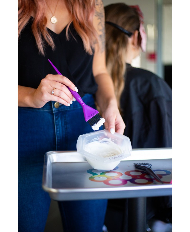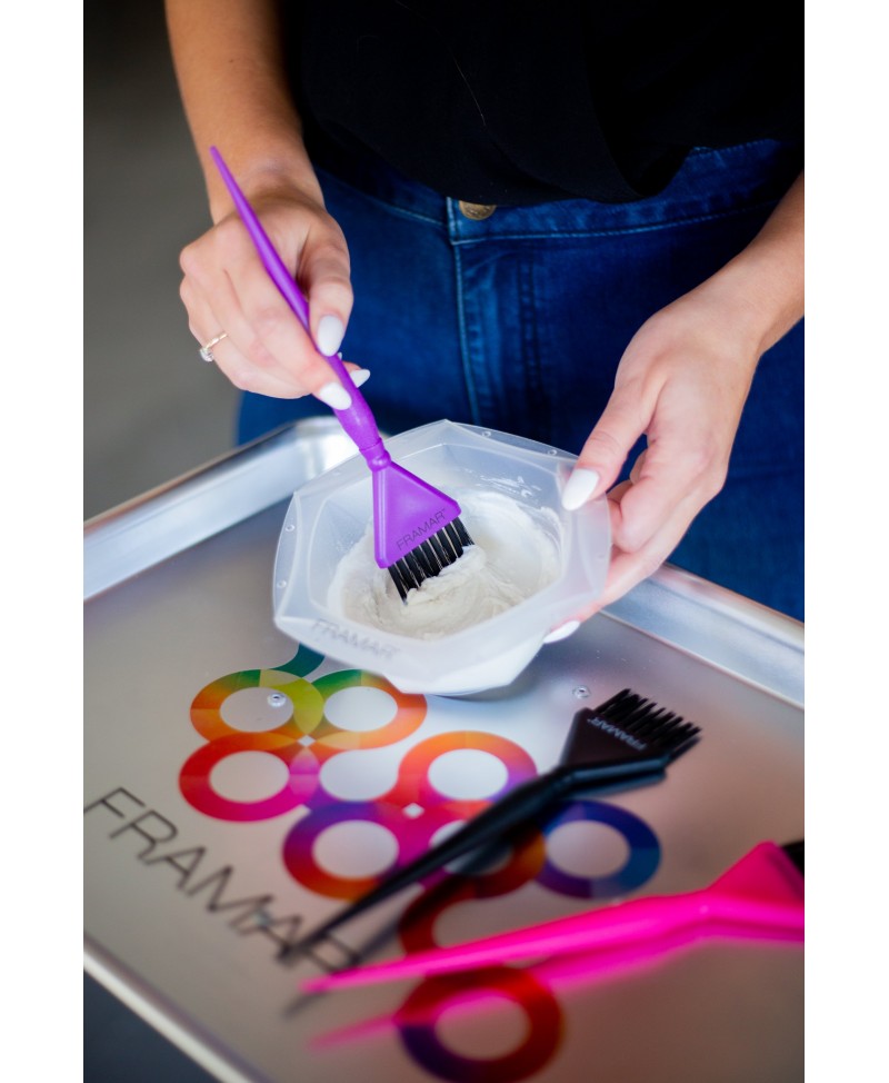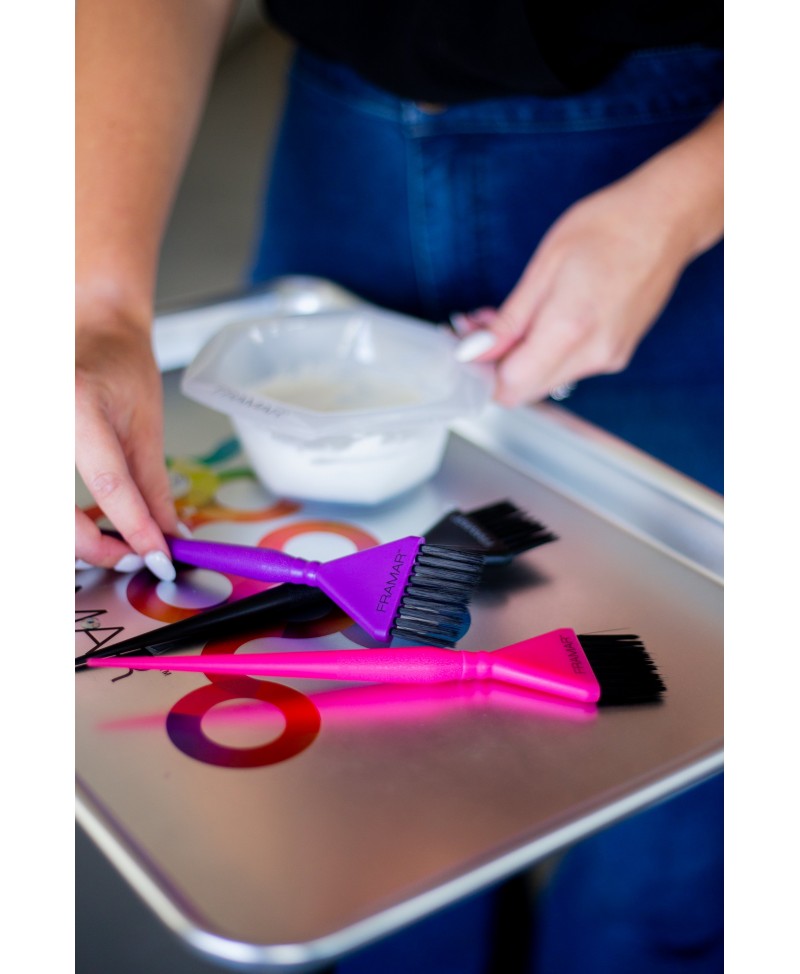Las famosas cerdas AccuSoft de Framar están afiladas para recoger y distribuir el color al cabello de manera uniforme, rápida y precisa.