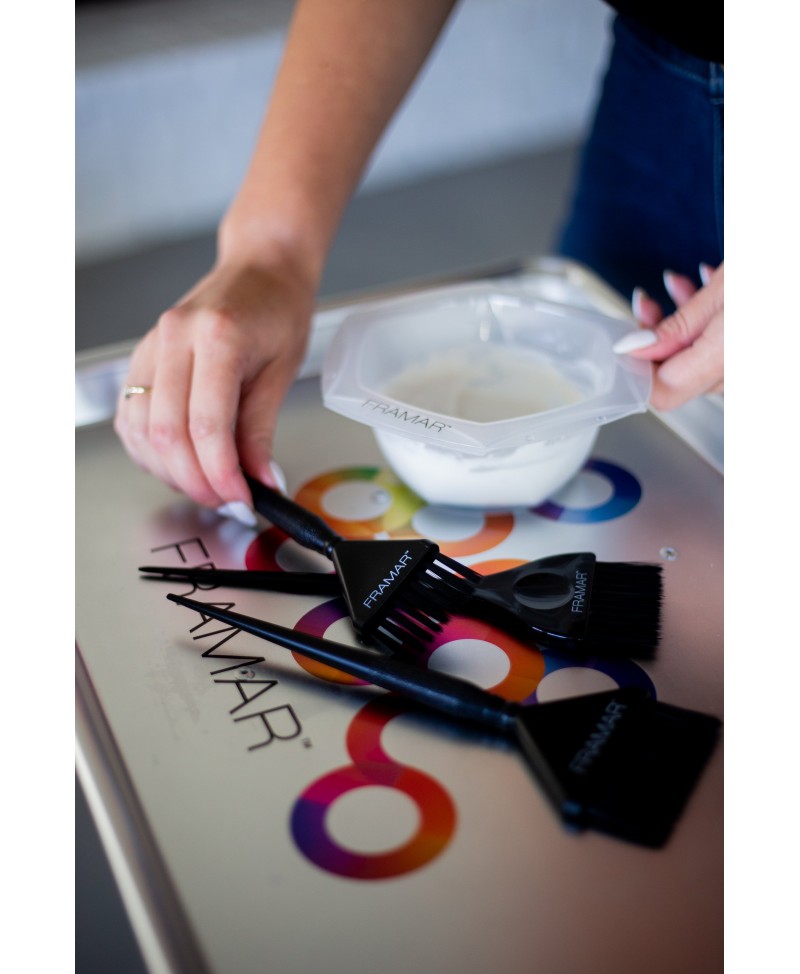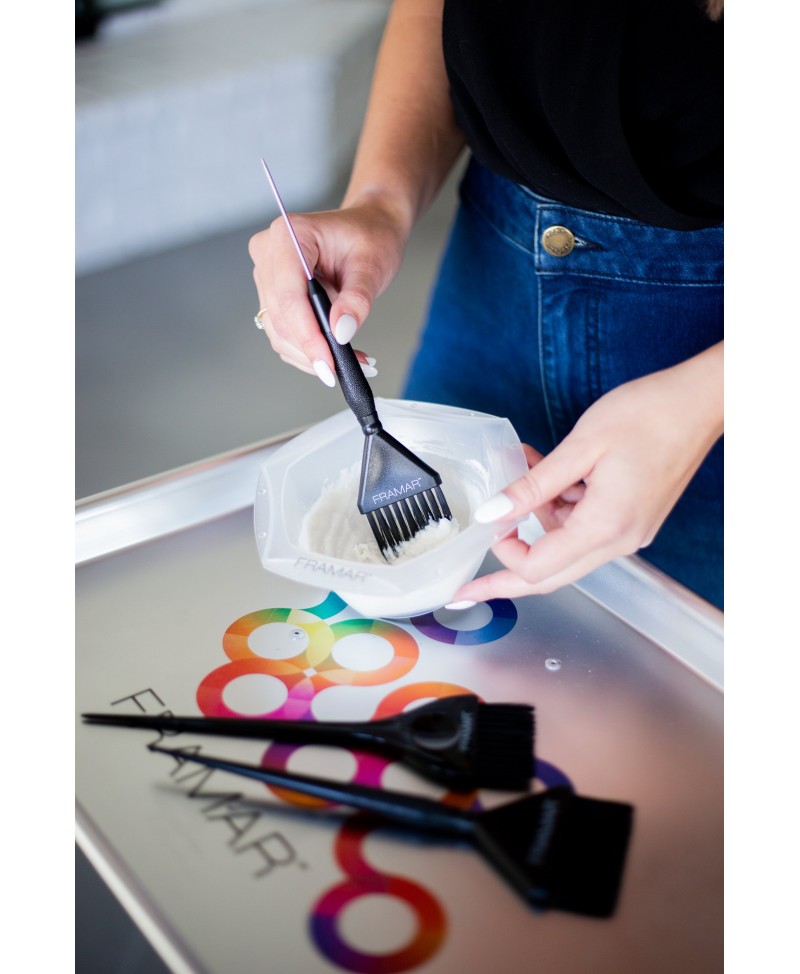 Las famosas cerdas AccuSoft de Framar están afiladas para recoger y distribuir el color al cabello de manera uniforme, rápida y precisa.